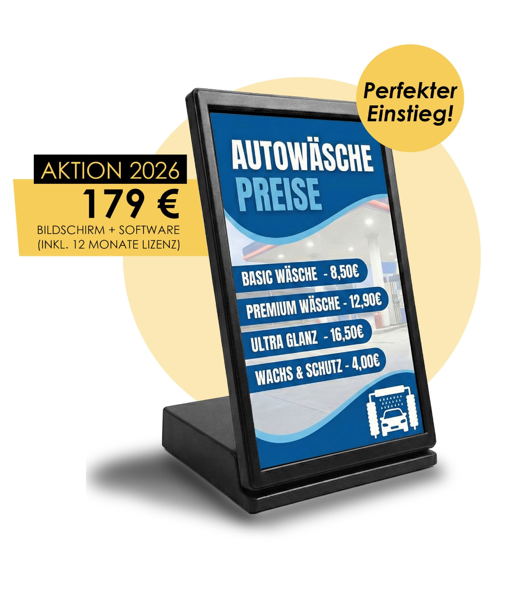 Bereits für einmalig 179 € starten Sie mit Ihrem eigenen Digital-Signage-Thekendisplay. Der Preis beinhaltet das Thekendisplay sowie die Lizenz für die CMS-Software für das 1. Jahr. Ab dem zweiten Jahr investieren Sie lediglich 39 € pro Jahr für Betrieb und Service.