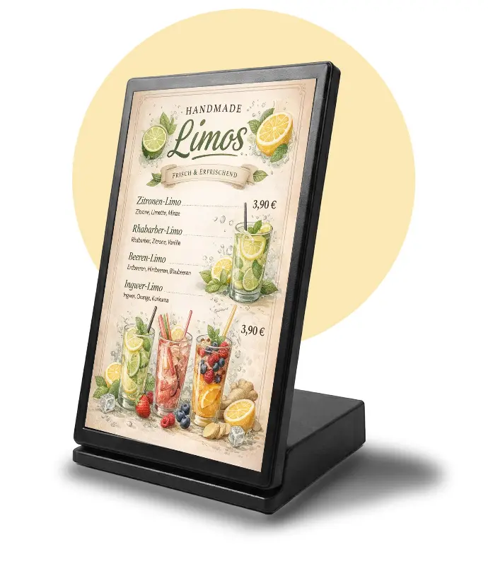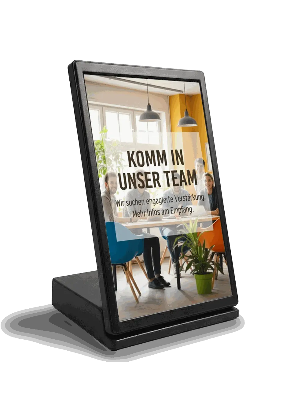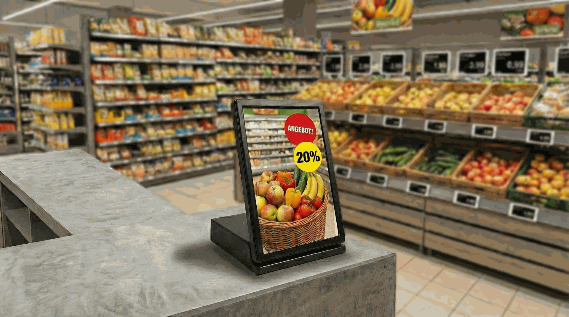 Das kompakte Thekendisplay fügt sich nahtlos in jeden Verkaufsraum ein und setzt Ihre Inhalte wirkungsvoll in Szene. Von tagesaktuellen Angeboten über aufmerksamkeitsstarke Werbung bis hin zu digitalen Speisekarten: